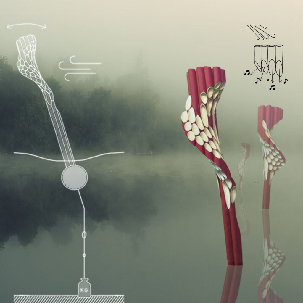 Tak jak drzewa stojące na wietrze, poruszając gałęziami wydają przy tym szum, który uspokaja, tak samo ta instalacja wchodzi w korelację z otaczającym ją żywiołem powietrza, który przechodząc przez puste w środku, przycięte rurki, wydaje uspokajający dźwięk, przy tym lekko bujając na boki, nowo odkrytą roślinę. Rzeźba współgra z wiatrem, dzięki temu staje się organizmem żywym.